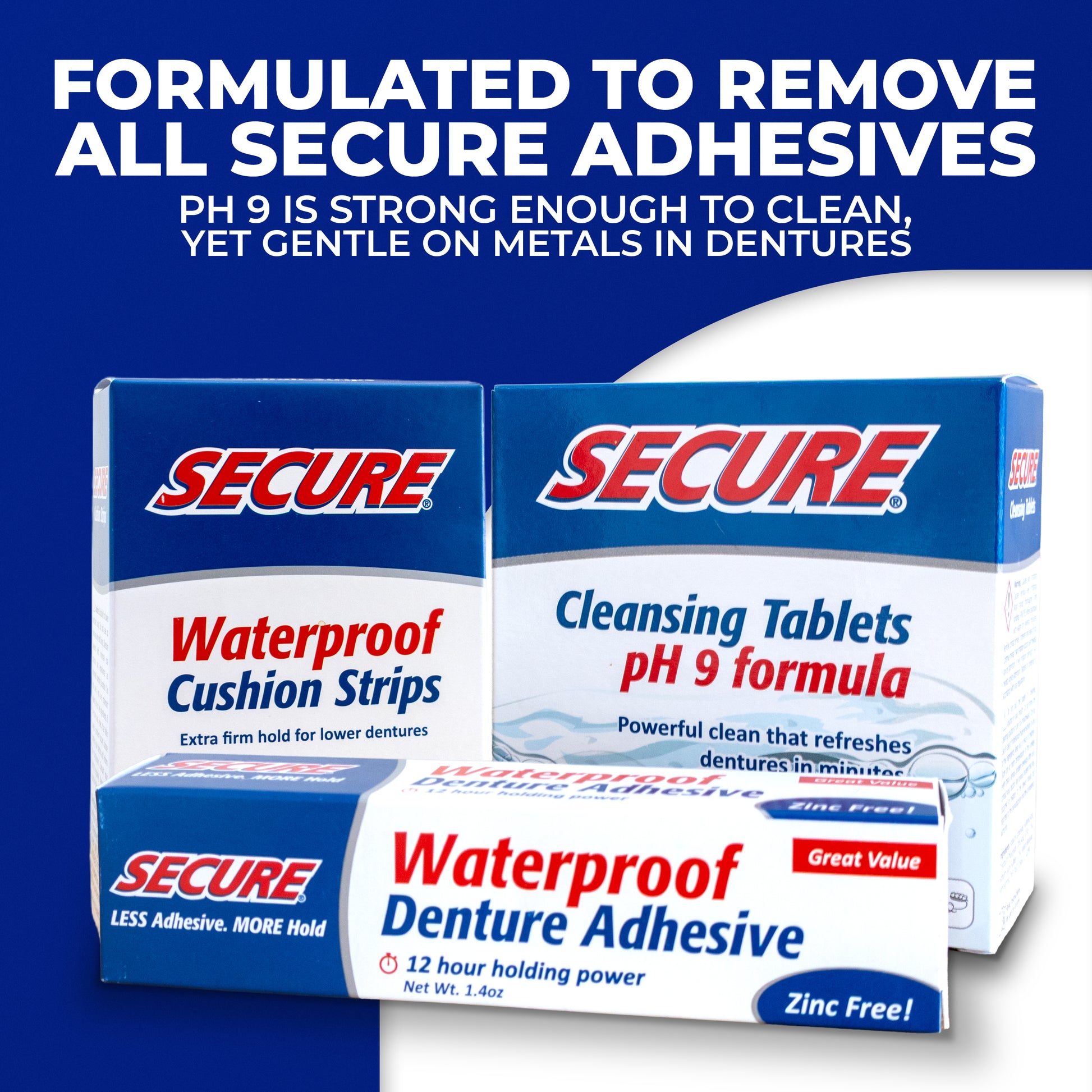 Secure Denture Cleansing Tablets feature a powerful alkaline pH 9 formula designed to effectively break down Secure Zinc-Free Denture Adhesive for a superior clean. Unlike standard denture cleansers with lower pH levels that are water-soluble and less effective at removing residue, our unique formula lifts and dissolves adhesive buildup to keep your dental appliance thoroughly clean.